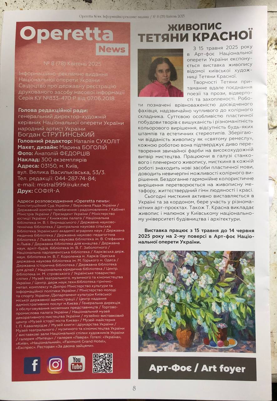 – персональна виставка в Арт-фойє Національної оперети України у Києві, 15.05 – 14.06. 2025 року. Виставлено 8 живописних картин.