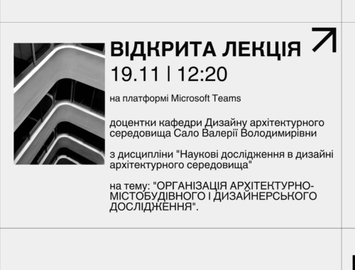 19 листопада 2025 року о 12:20 на платформі Microsoft Teams відбудеться відкрита лекція доцентки кафедри Дизайну архітектурного середовища Сало Валерії Володимирівни з дисципліни “Наукові дослідження в дизайні архітектурного середовища” на тему: “ОРГАНІЗАЦІЯ АРХІТЕКТУРНО-МІСТОБУДІВНОГО І ДИЗАЙНЕРСЬКОГО ДОСЛІДЖЕННЯ”. Запрошуються усі бажаючі. Доєднатися…