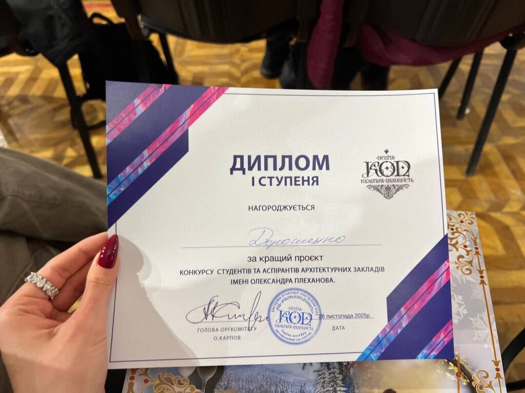 За підсумками конкурсу студентка 2 курсу Марія Козлова з проєктом «Кафе на 50 місць», виконаним під керівництвом: доц. Гомон О.О., асист. Булкіної М.М., асист. Кантаурової Н.А. кафедри теорії архітектури і архітектурного проєктування КНУБА здобула І місце, отримавши Диплом І ступеня та путівку.