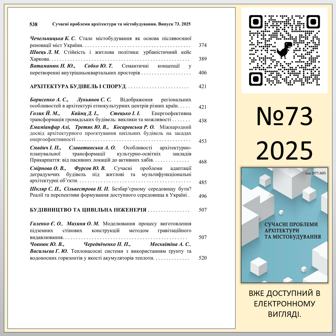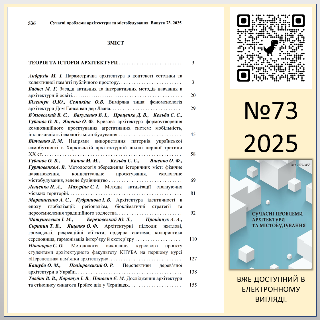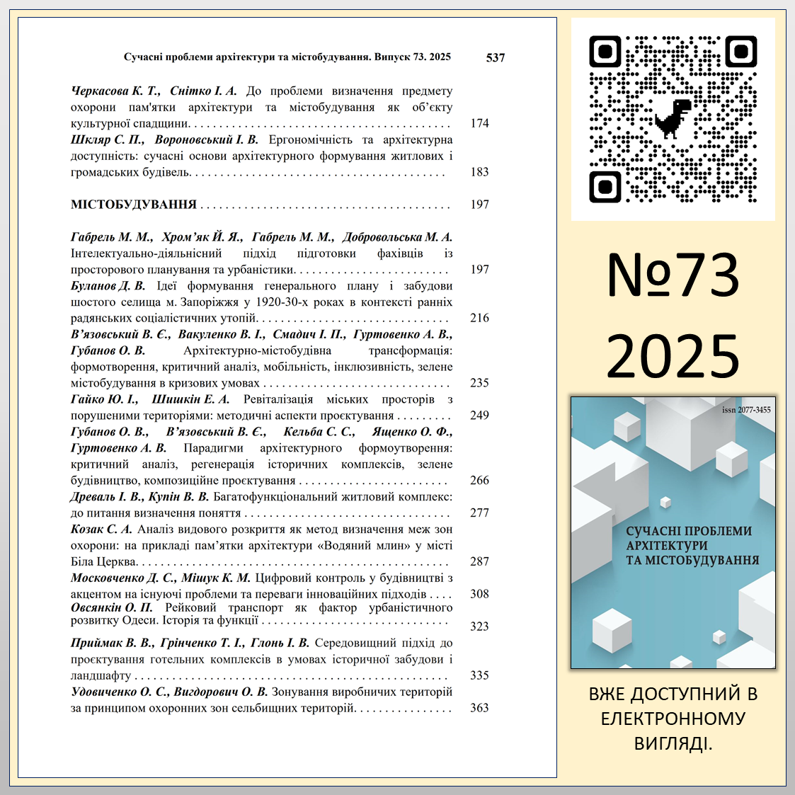 “СУЧАСНІ ПРОБЛЕМИ АРХІТЕКТУРИ ТА МІСТОБУДУВАННЯ” №73 (2025)