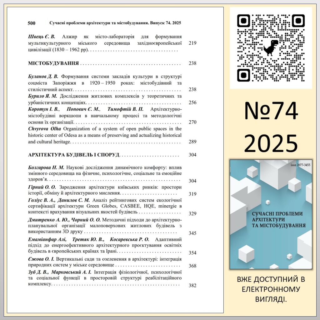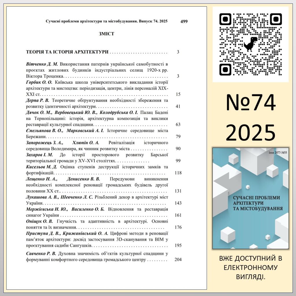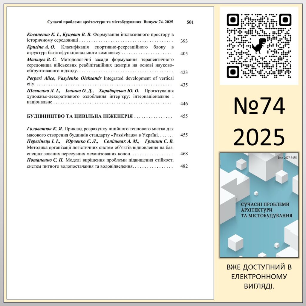 “СУЧАСНІ ПРОБЛЕМИ АРХІТЕКТУРИ ТА МІСТОБУДУВАННЯ” №74 (2025)