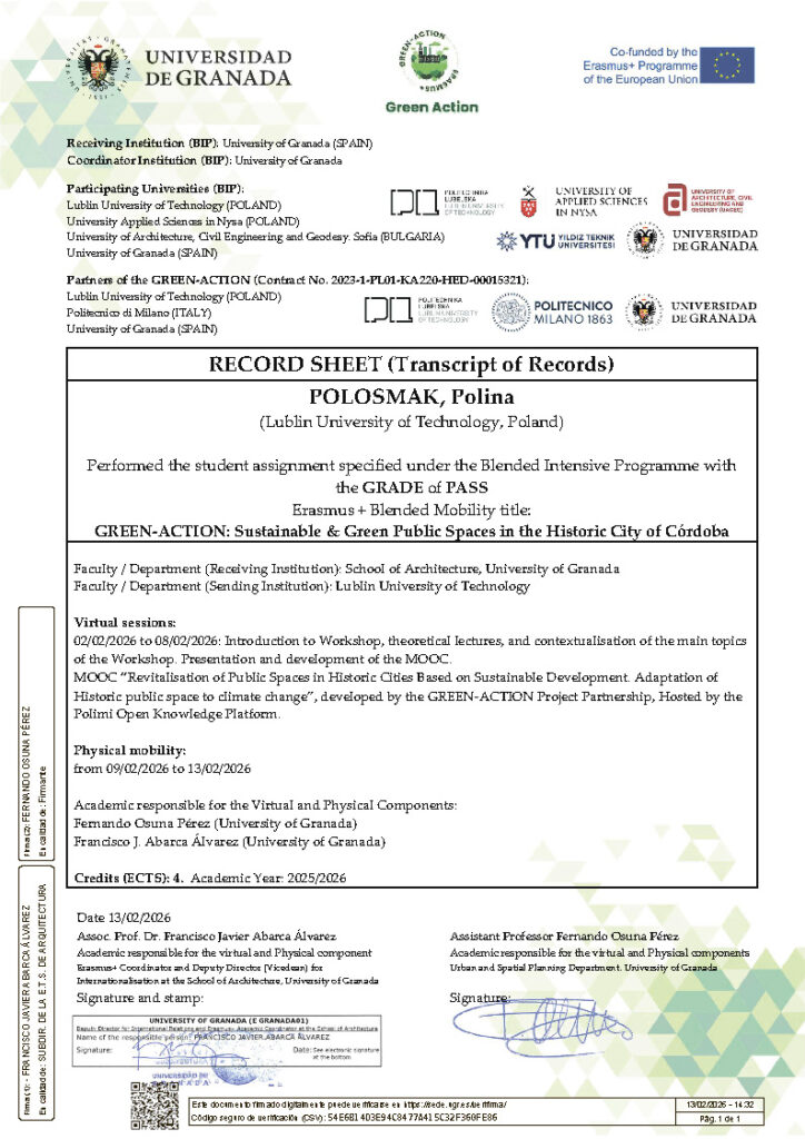 Професори з Люблінської Політехніки помітили цю синергію і запропонували студенткам особливу можливість – взяти участь у міжнародному воркшопі Erasmus+ Blended Intensive Programme (BIP) “GREEN-ACTION: Sustainable & Green Public Spaces in the Historic City of Córdoba”, що проводився в Университеті Гранади (Іспанія). Так лютий 2026 року став місяцем незабутних відкриттів для наших дівчат, які приєдналися до групи студентів з провідних європейських университетів.