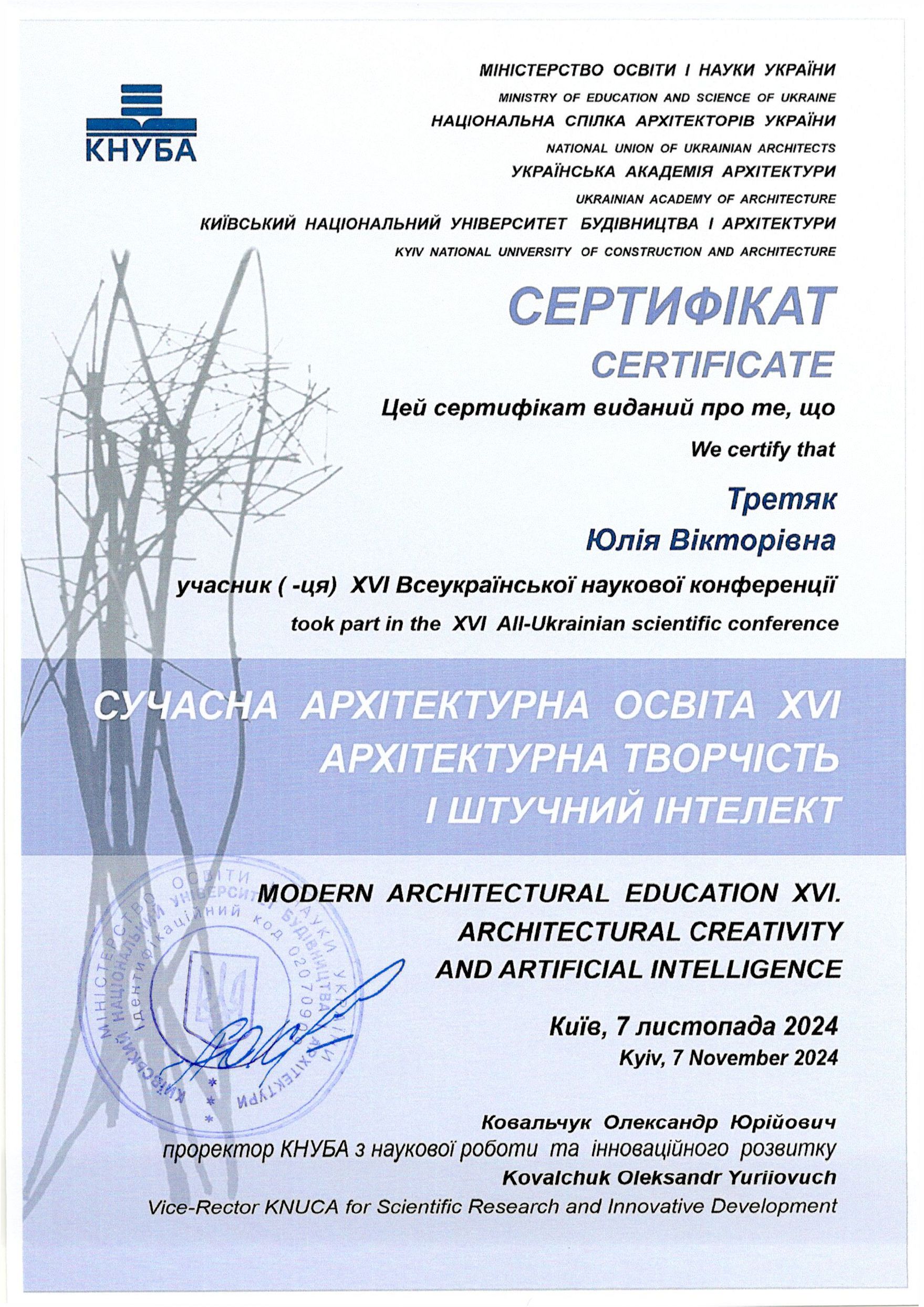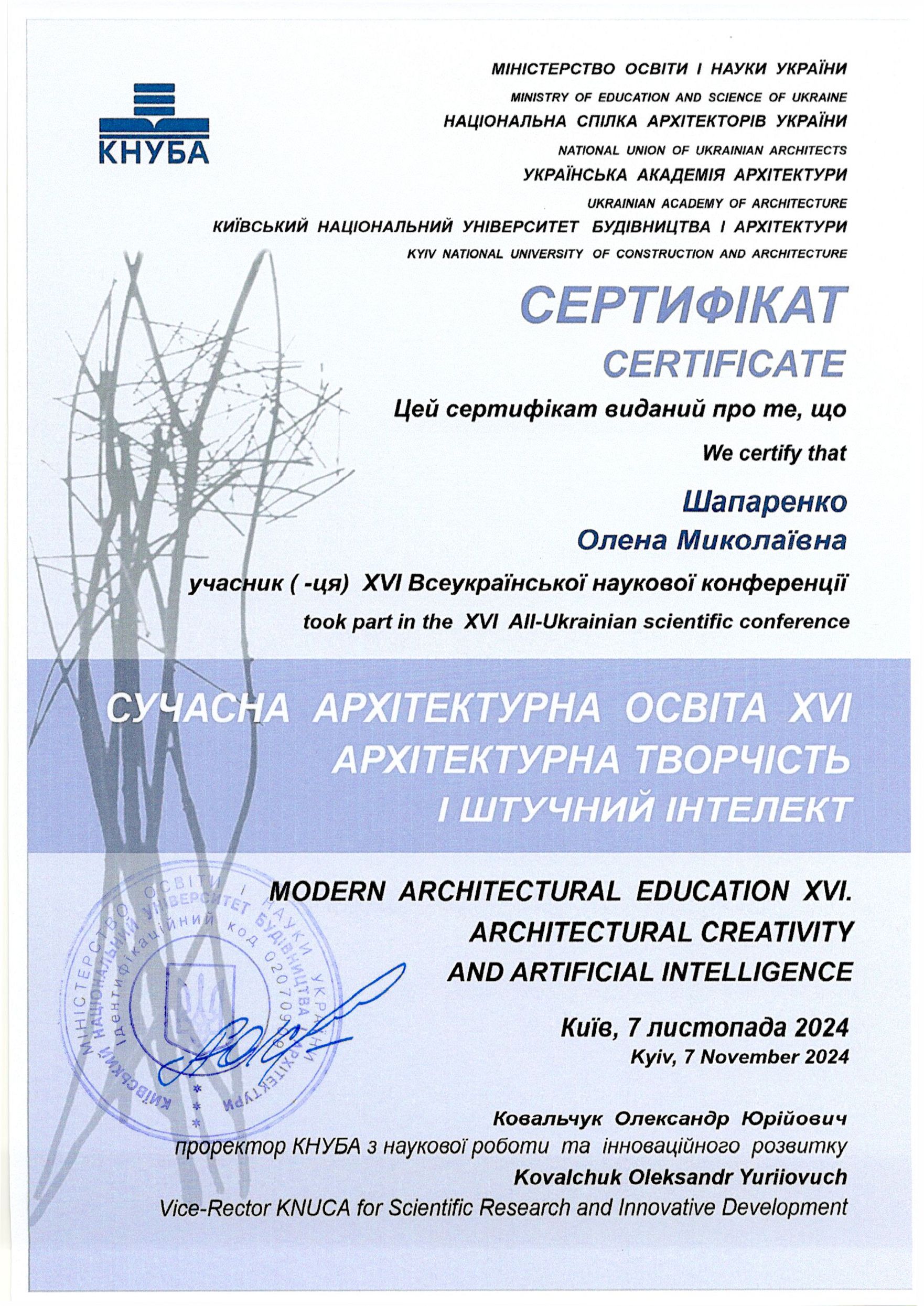 Новікова Ю.А., Шапаренко О.М. Використання штучного інтелекту для дизайну середовищ та візуалізації ідей. Програма доповідей XVІ Всеукраїнської наукової конференції «СУЧАСНА АРХІТЕКТУРНА ОСВІТА: АРХІТЕКТУРНА ТВОРЧІСТЬ І ШТУЧНИЙ ІНТЕЛЕКТ». (07 листопада 2024 року), Київ, 2025. С.88-90. URL: https://library.knuba.edu.ua/node/51