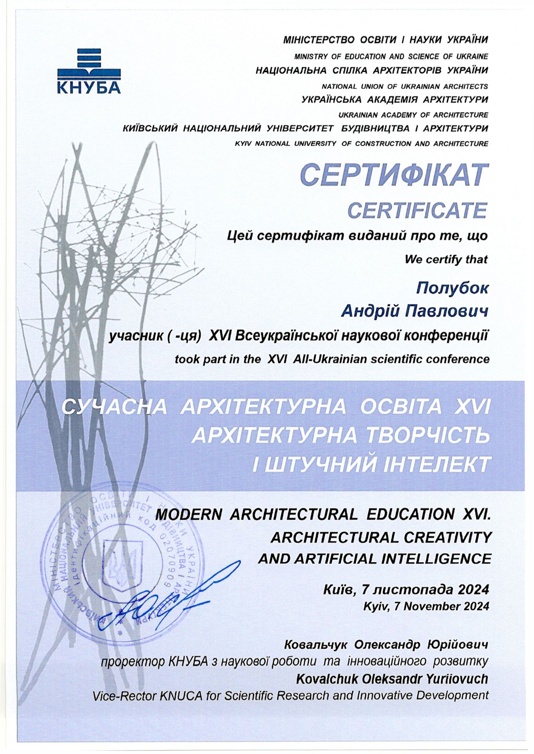 Полубок А.П.,Гетманчук В.О. Сучасні тенденції в дизайні інтер’єрів закладів вищої освіти архітектурно-мистецького спрямування. Програма доповідей XV Всеукраїнської наукової конференції «Сучасна архітектурна освіта: відбудова та розвиток в європейському контексті». (23 листопада 2023 року), Київ: КНУБА, 2025. С.98-100. URL: https://library.knuba.edu.ua/books/zbirniki/20/2025/Suchasna_arkhitekturna_osvita_XV.pdf.pdf