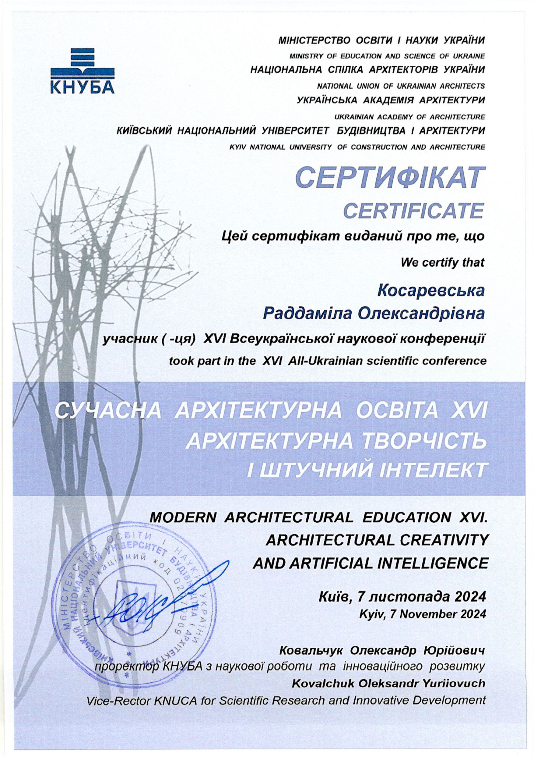 Косаревська Р.О. ІНТРОВЕРТНА ТА ЕКСТРАВЕРТНА АРХІТЕКТУРА ЯК СЕМІОТИЧНИЙ ДІАЛОГ КУЛЬТУР. Інновації в архітектурі, дизайні та мистецтві: до 150-річчя Олександра Вербицького: збірник матеріалів IV Міжнародної науково-практичної конференції, Київ (21-23 травня 2025 р.), Київ: НАОМА, 2025. С.113-115. URL: https://drive.google.com/file/d/1-wxce8s1-K3ga83ffUacXn6jyPCyDccA/view