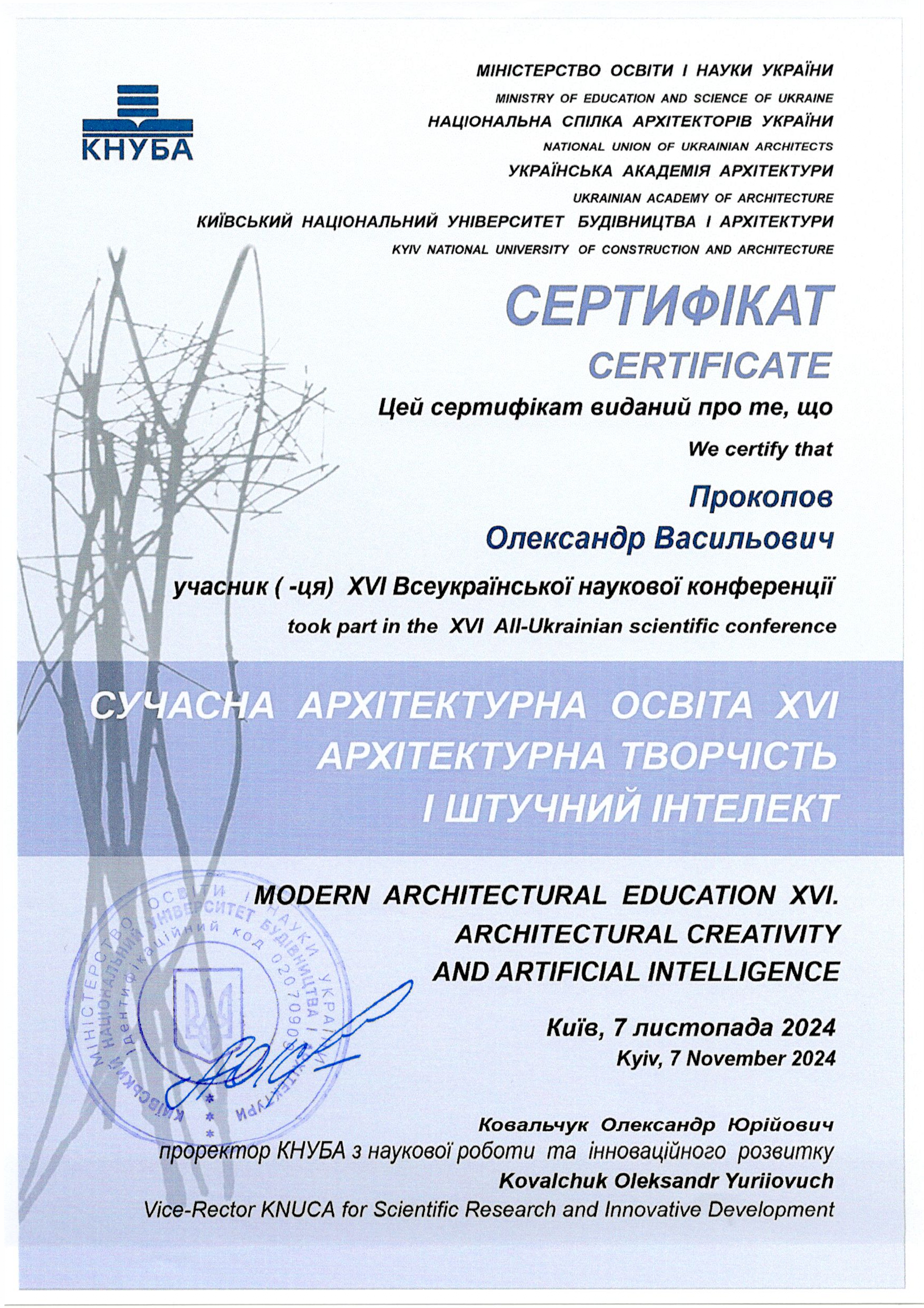 Ничипорук-Ніколаєв А.С., Прокопов О.В. Використання відеомапінгу у сфері архітектури та дизайну. Програма доповідей XVІ Всеукраїнської наукової конференції «СУЧАСНА АРХІТЕКТУРНА ОСВІТА: АРХІТЕКТУРНА ТВОРЧІСТЬ І ШТУЧНИЙ ІНТЕЛЕКТ». (07 листопада 2024 року), Київ, 2025. С. 87-88. URL: https://library.knuba.edu.ua/node/51