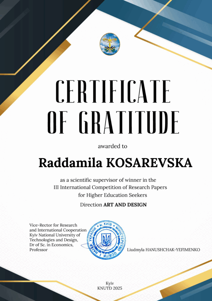Сертифікат про участь в Міжнародному науково-технічному форумі “Архітектура, Дизайн та Будівництво: Інноваційні технології” №KNUCA-23-11-037 від 16.11.2023 (15-16.11.2023, Київ, Україна).
